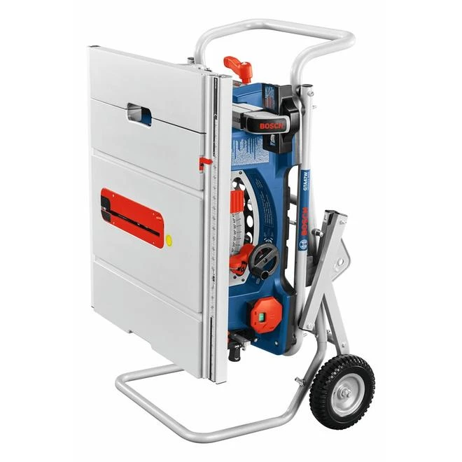 This Bosch table saw has exceptional cutting capacity and is ideal for all jobsites. It features built-in storage for saw equipment and tools, and an ultra-resistant wheeled base for easy portability. The SquareLock rip fence glides along the rail with a single finger and locks at a precise level to ensure maximum cutting accuracy. The integrated sub-base protects the table saw from impacts and kickbacks, while the Constant Response start-up system is quiet, providing reduced torque while remaining powerful enough to ensure consistent cutting speeds. The riving knife prevents material from pinching the blade and ensures everything is positioned exactly right when performing upright cuts, non-through cuts and splitting tasks. Backed by a 1-year limited warranty.