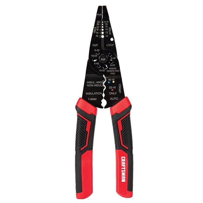 The 8” (20.32′ cm) Craftsman® wire stripper, cutter, crimper is equipped with multizone bimaterial grips for comfort and control. It strips and cuts 10-22 AWG, cuts bolts to size and leaves perfect lead thread. The wire crimper crimps insulate and non-insulated terminals.
