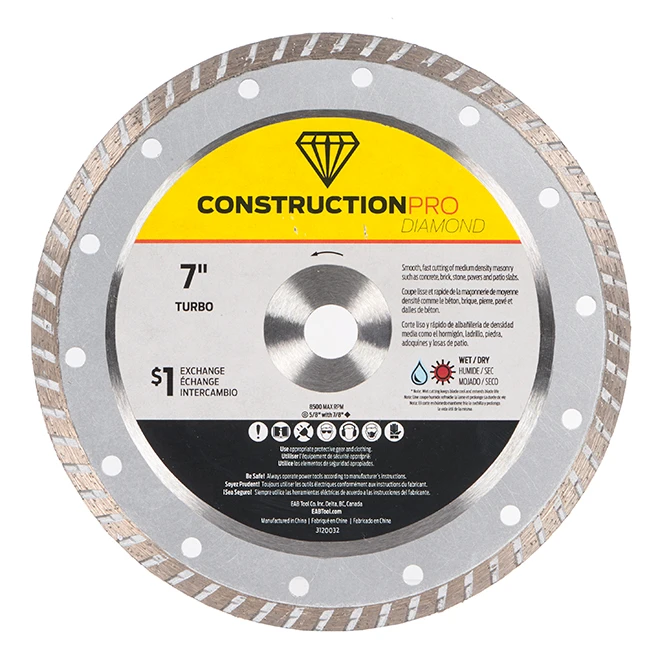 Create smooth cuts through stone, cured concrete, brick and similar materials with this 7 in circular saw blade. The steel and diamond components of the diamond saw blade offer precise cuts and lasting performance. This Turbo saw blade has a maximum speed of 8450 RPM for blazing-fast cutting. It has a 5/8 in arbour.