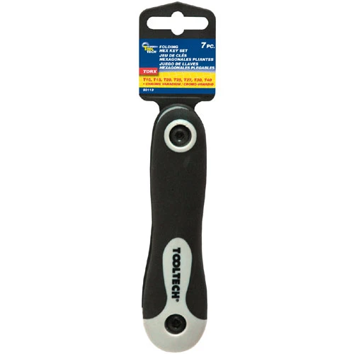 7-piece folding torx hexagonal key set. Made of chrome vanadium steel with chrome plating. Double injected rubber grip. Sizes: T10, T15, T20, T25, T27, T30 and T40.