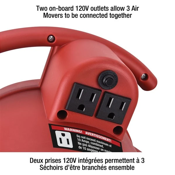 - Comes with two on board 120 V outlets to connect up to 3 air movers together for bigger jobs