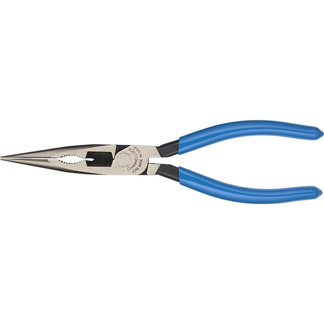 The Channellock(R) E Series long-nose plier is used to cut wire in hard-to-reach areas. It features Xtreme Leverage Technology (XLT) that greatly reduces the force required to cut compared to traditional heavy-duty pliers. The crosshatch pattern on jaws adds multiple contact points, allowing a better grip. The high-carbon steel design with rust-proof coating ensures optimal durability, while the lightweight, ergonomic vinyl-covered handle is designed for comfortable extended uses. The product comes with a limited lifetime warranty.