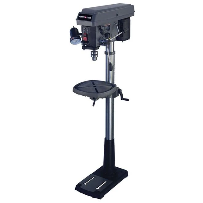 The Porter Cable 15-inch floor drill press offers many upgraded features not found on bench models. The X-Y axial projecting laser lines provide accurate pre-alignment of drill location, while the 4-inch spindle travel provides extra drilling capacity. Twelve operating speeds ranging from 300 to 3100 RPM for easy wood or metal drilling and sanding operations. A cast-iron worktable, surface tilts up to 45° right or left for bevel drilling, oil channel around edges for metal drilling, and a 7 ½-inch swing with a 5/8-inch chuck. Rack and pinion worktable elevation feature for quick and accurate height adjustments, and built-in adjustable work lamp (maximum 40 watts) for better visibility in your work area. The depth adjustment gauge allows accurate drilling of repetitive depth holes.