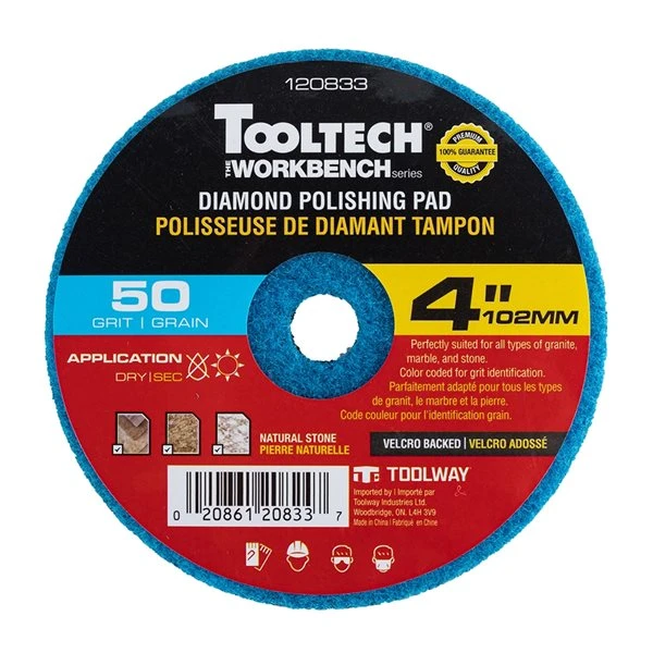 Tooltech’sĀ® line of Workbench Series 4-in polishing pads are designed for the grinding and polishing of marble, granite, ceramics, and other stone materials. Designed to fit most hand grinders, this set includes 7 dry pads and one adaptor. Pads are colour coded for quick grit identification and hook and loop are backed for rapid and effortless changing. These diamond pads are rated for high sharpness and can be used dry.