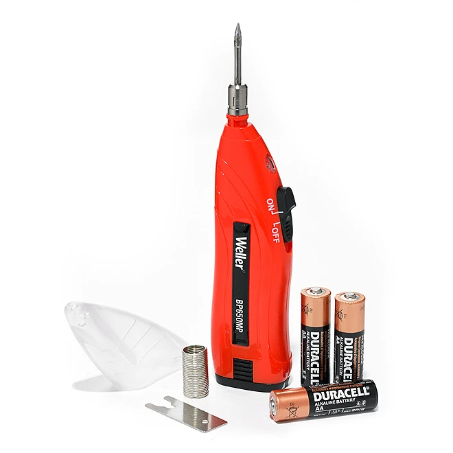 The Weller 4.5 W soldering iron kit works with batteries. It includes an iron, a tip, three AA batteries, a lead free solder and a tip wrench. It heats up to the working temperature of 900°F in under 30 seconds, and its red LED indicates when power is on. The protective safety cap turns off power when placed on tool. Perfect for field service repair on small parts and components, it can do over 120 intermittent solder joints with fresh batteries. The kit is covered by a limited lifetime.