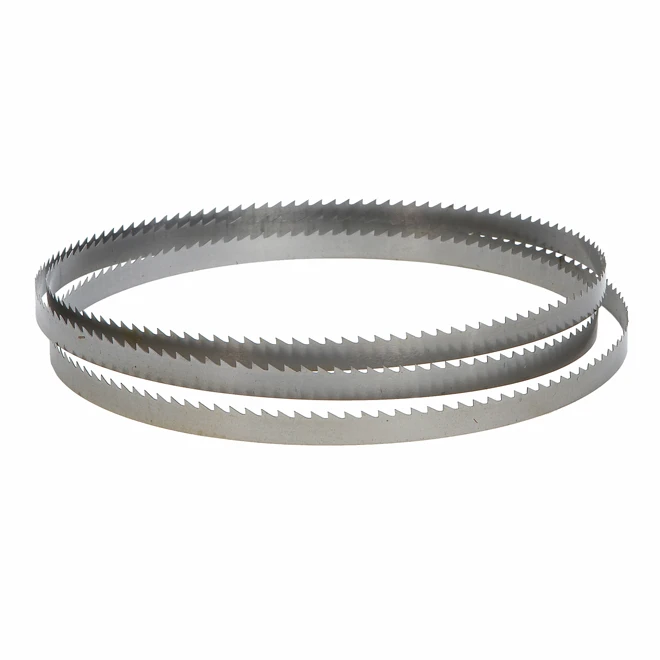 This 59 1/2” x 3/8” (151.1 cm x 1 cm) band saw blade is perfect for heavy duty cutting in all woods, plastics and composite materials. The blade is made of durable carbon steel. It features 6 TPI and 1/4” (0.6 cm) minimum radius.