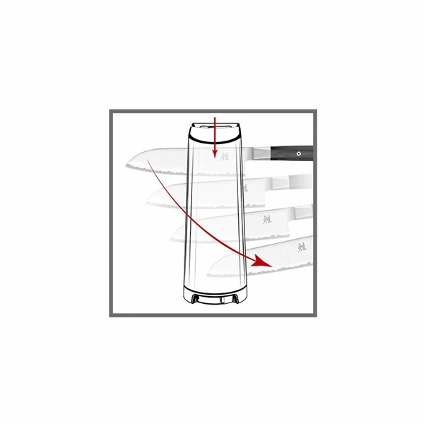 Regular sharpening is crucial for maintaining their quality over the long term. The ZWILLING V-Edge knife sharpener professionally sharpens knives for you. Its patented sharpening mechanism is incredibly simple and wholly effective. Simply pull the knife’s blade at a diagonal from above in a downward direction and the V-Edge does the rest. The V-shape arranged ceramic sharpening stones evenly sharpen the entire length of the blade without risk of damaging it. Different angle adapters are included for European and Japanese knives. The adapter not currently in use is conveniently stored in the base of the V-Edge to save space. The professional sharpening stones with ranging grain sizes are quickly exchanged with minimal fuss. Your knives will retain their professional sharpness, and you’ll enjoy cooking with them even more.